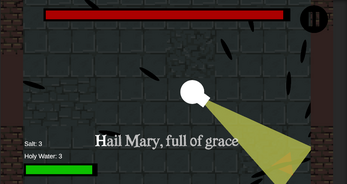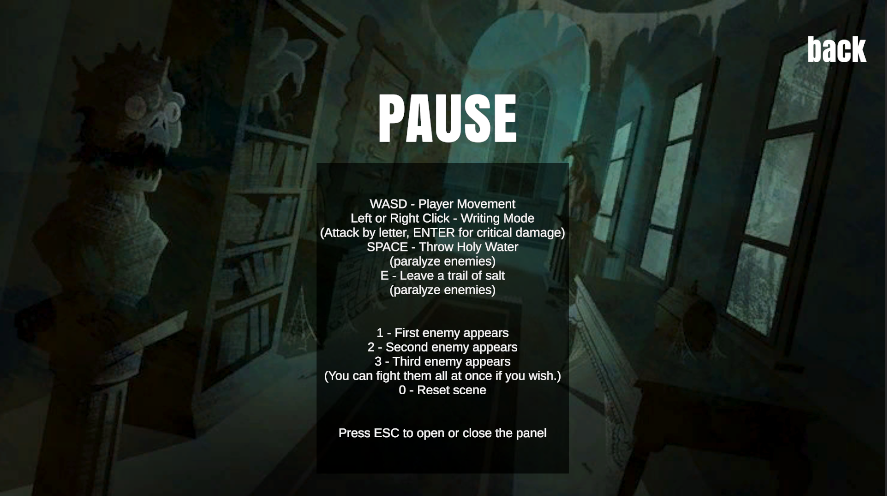 WASD - Player Movement Left or Right Click - Writing Mode (Attack by letter, ENTER for critical damage) SPACE - Throw Holy Water (paralyze enemies) E - Leave a trail of salt (paralyze enemies) 1 - First enemy appears 2 - Second enemy appears 3 - Third enemy appears (You can fight them all at once if you wish.) 0 - Reset scene
